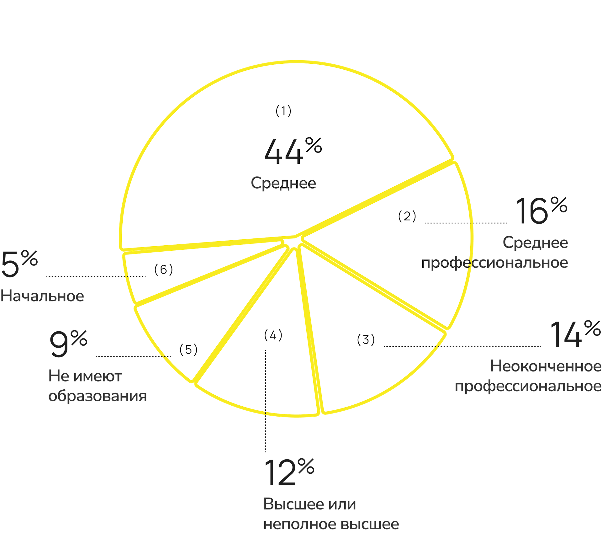Опрос показал, что большинство респондентов имеют среднее образование. Часть участников завершила или частично получила высшее образование, а некоторые — среднее профессиональное. Также среди опрошенных есть люди с начальным, неоконченным средним образованием и те, кто его вовсе не имеет.